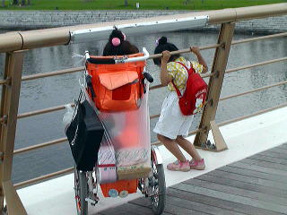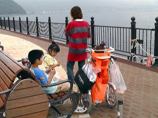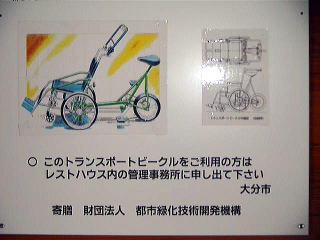 レストハウスの中に、自転車と車椅子が 合体したものが。 おーこれは便利。 体の不自由な人やお年よりと一緒に 風を感じることができる。 ん〜こういうの我が家にも一台欲しい! |