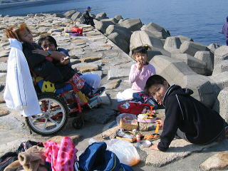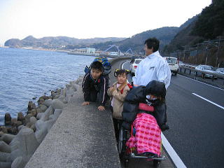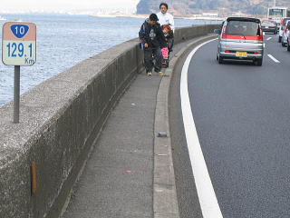 国道を歩く。。。怖いぞー。 美琴の車椅子でも片輪はみ出る場所あり 最後まで車椅子でいけるように 道幅 改装してくれ〜〜 せっかく平坦な景色のよい海沿い 車椅子単独 西大分まで行きたいぞー |
