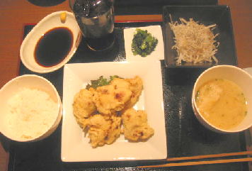 大きなとりてん:白ご飯:あげと豆腐の味噌汁:大根とちりめんのサラダ:漬物: