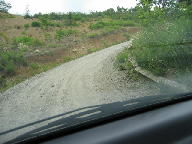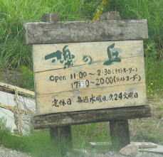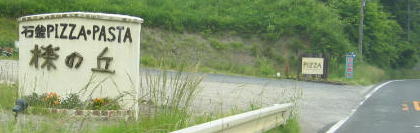 インターおりて、走ってると、こういう看板が。砂利道を登った上にあります。