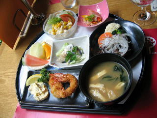 ランチプレート本日のスープスモークサーモンとポーチエッグ、トマトのパスタバジル風味、豚肉の香味揚げ甘酢ソース、白身魚と大葉のパン粉揚げタルタルソース、有頭海老のしょうが煮、生ハムとフルーツ、サラダ、お任せご飯、デザート、