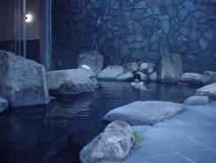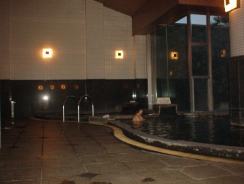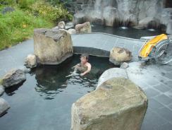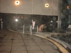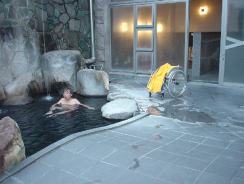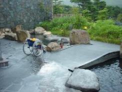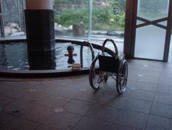 ここの露天風呂も広くて車いすで自由に動けます。打たせ湯3本が落ちる大きな湯船の快適さ