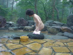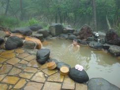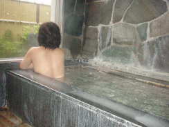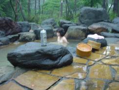 階段を下ると赤松の林包まれ野趣にあふれている温泉、5〜6人くらい入れそうな岩風呂。車いすでは無理がある。