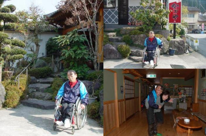 宿の玄関までは6段ほどの石段があり、玄関は20cm程の一段。車いすまま上がって良いかと聞くとは上がれない凹でおんぶされる。しかし廊下ははってズボンにはゴミひとつ付かない様までに清掃がとても行き届いている。納得、車いすは一応我々の足だが土足と同じです。エチケットカバーを持っていれば別ですが、我が家でも畳の部屋まで車いすはあげません。