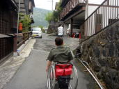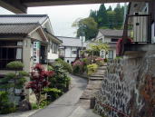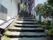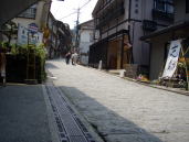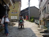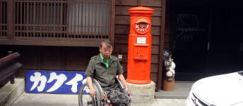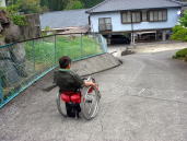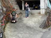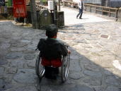 湯平温泉←湯布院町の奥にある川沿いをたたずむ標高600mの谷あいに位置し石畳引き詰めた坂道がある。急な斜面に石が積まれているのでキャスターを上げて下がるが凸凹なのでタイヤが浮いてスリップする。こんな所で車いす使用者はどの様な生活をしているだろうか。