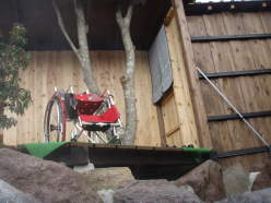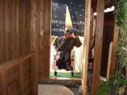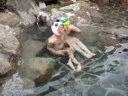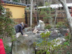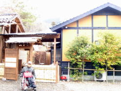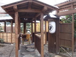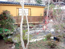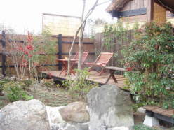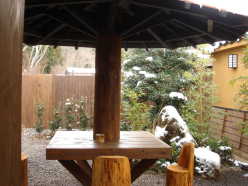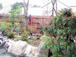 雪があちらこちらに残っており露天風呂は寒いと思いつつ、にぎやかな湯布院の温泉街から少し離れた由布岳のふもとの別荘地に佇むお宿が2005年4月にオープンした。客室は母屋の離れ形式が3つと古民家風離れが1つ。二間続きの広々とした造りで、すべて趣きの異なる設えとなっている所に「楓の小舎」(かえでのしょうじゃ)があり、由布院盆地を見下ろす事が出来る古民家風の木造の屋根で囲った石畳みを進んでいくと入り口は30cmほど石段三つ、ウッドデッキ風の脱衣場で大人5人ほど入れる広い露天風呂がある。熱めのお湯がふんだんに出ているのであらかじめ係人さんが水を埋めてくれたが熱かった。
