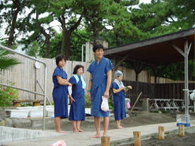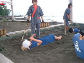 砂かけさんたちが上手に砂をかけてくれる。10分間、海を眺めつつ砂独特の温もりを楽しもう。