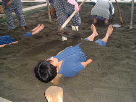 砂湯は常に42度に保たれており、専用浴衣に着替えてそこへ寝転べば、あとは