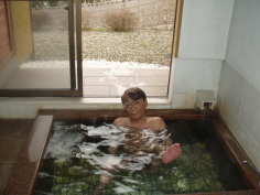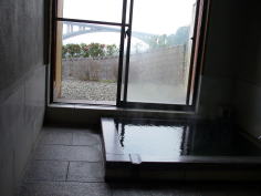 浴槽は二人が入れるほどの小さな内風呂だが大きな窓を開けると大分自動車道の世界一コンクリート造りのアート橋が(別府明礬橋)見えるので開放感が味わえました。お湯は白っぽい薄青色、明礬温泉らしく湯の花が浮いていますよ♪