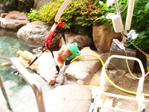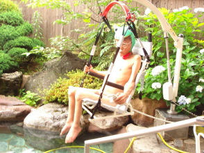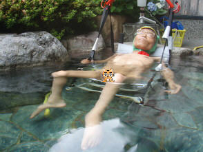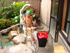 操作は簡単、車いすから乗り移ると車輪を外して向きを浴槽に変え、リモコンでお湯加減をみながら沈むことが出来る。これならお尻にと〜てん優しく、重度な方でも入られ介護の方にも楽である。