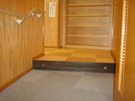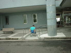 入り口は緩やかなスロープ、脱衣場は20cmの一段、一人では無理ヘ(;゚゚)ノ浴槽に行くには10cmの一段、バックで行け