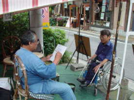 見ると「湯布院元祖の似顔絵描きじゃけん、どうな、あんたじゃっら500円でいいけん」