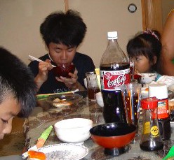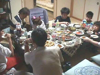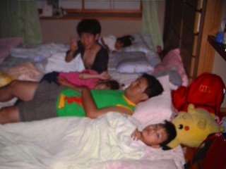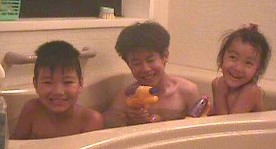 | たつやくんといっしょにお風呂に入る 長男と次女。 たつやくんは、いつも一人で入るんだってね。 これで「裸のおつきあい」でますます 仲良くなれそうだね。 風呂上がってよしさんのすいかを食べた。 大きくておいしくていつもよりいっぱい食べたから 次女が 食べ過ぎて吐いた |