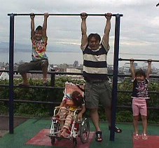 | 7/19 6:30フェリー降りて阪神高速へ! ナビの調子が悪くて迷う・・・。 でも無事に滋賀県まで到着!! 後ろは海のような琵琶湖! 鉄棒にぶら下がって体を伸ばそう〜〜 |