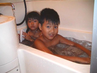 | ホテルのおふろ、せまい、、 やっぱりけんかする二人、、、「もー水かけんで!」 「あっち行って、せまい!!」 |