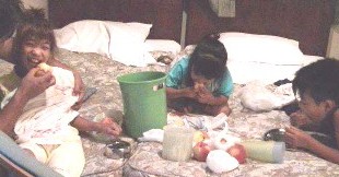| ツインの部屋。ベッドをひっつけてねた。。 おっと寝る前に桃。 福島といえば桃!! ん、みずみずしいぞ。 むしゃぶりつく子供たち |