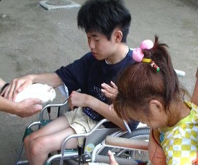 | 軽く体操して水分補給〜 水筒に水を入れて 水遊び〜〜〜みこの脚に水をかけてあげる 次女 「気持ちいいやろ、みこちゃん」 |