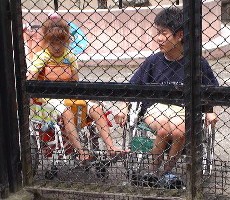 | やぎが怖くて外で待っているのに、、 僕たちがおりの中にいるみたいだね、、、 |