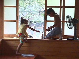 | けいママにおんぶされた かなちゃんと 魚を口に入れてくれるsadaパパ 片手にビール |