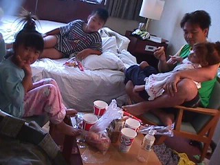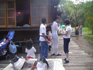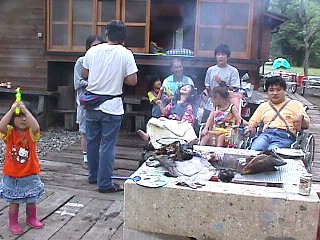 | 秋保温泉「木の家」に時間どおり到着 駐車場からロッジまでが遠くて山を降りるかんじで 険しくて道が悪く車椅子は危ない。おまけに ロッジはクーラーがない。荷物を運ぶまで疲れた。 JUNは早く帰るとのことで白タイツマン!! トランクスはハム太郎 手前にはおいしそうな大きなマグロの兜焼き!! sadamariファミリーもって来てくれました 到着後すぐに缶ビールいただきました〜〜 |