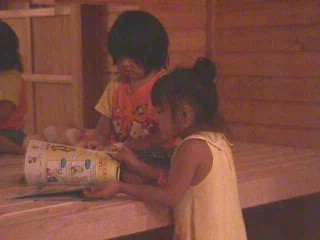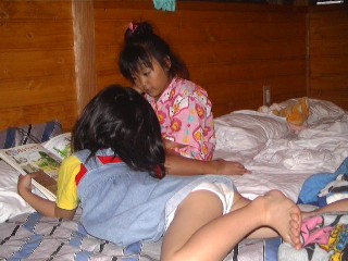 | 夜遅くまで子供たちも興奮気味で なかなか寝ない。 不良ママのあんなちゃんと絵本を読むめが丼。 |