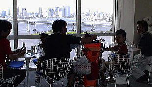 | お昼はレインボーブリッジをみながら 軽くランチ〜〜〜 レインボーブリッジは虹色じゃないんだ〜 一番右がお世話になった「くまさん」 忙しい中、ずっといっしょにいてくれて ありがとうございました〜〜〜 |