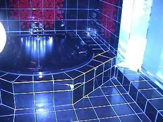 | 風呂〜〜見えにくいが黒い貝の風呂だったんだ。 丸くて入りにくい〜〜〜 つるつるすべってすべりだい〜〜 |