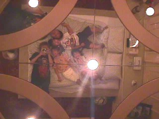 | だ〜〜〜!!ベッドの上は 鏡張り〜〜〜 いえーーーーーい!!!! 興奮しよう〜〜〜(なんのこっちゃ) と、、、このベッドに横に 5人ねたんだ。。。。 夜中に次女のめが丼が落ちそうになって、、、 次女だけ下の床に寝ました。。。。 寝返りするとベッドから落ちそうな一番端っこの くまんだった。。 |