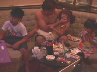 | 二件目のラブホに決定〜〜5人で7800円 サービスに生ビール2杯あーんど、スパゲティと お好み焼き〜〜 ついでに人のいいおばちゃんのおかげで おちびちゃんたちに、、って、 コーラー2缶。お好み焼き一枚追加サービス! おー部屋が白い部屋だ〜〜御殿だ、城だ〜 |